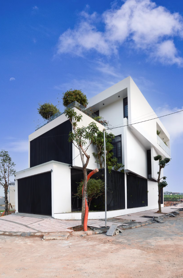 Tổng quan, ngôi nhà nhìn từ bên ngoài là các hình khối được sắp xếp chắc chắn, kiên cố. Với cách xử lý mặt bằng hợp lý, cách bố trí giếng trời, mảng tường chéo để chắn nắng, kiến trúc sư đã tận dụng lợi thế của nhà lô góc 2 mặt tiền cũng như hạn chế tối đa của hướng Tây để hình thành công trình kiến trúc ấn tượng.
