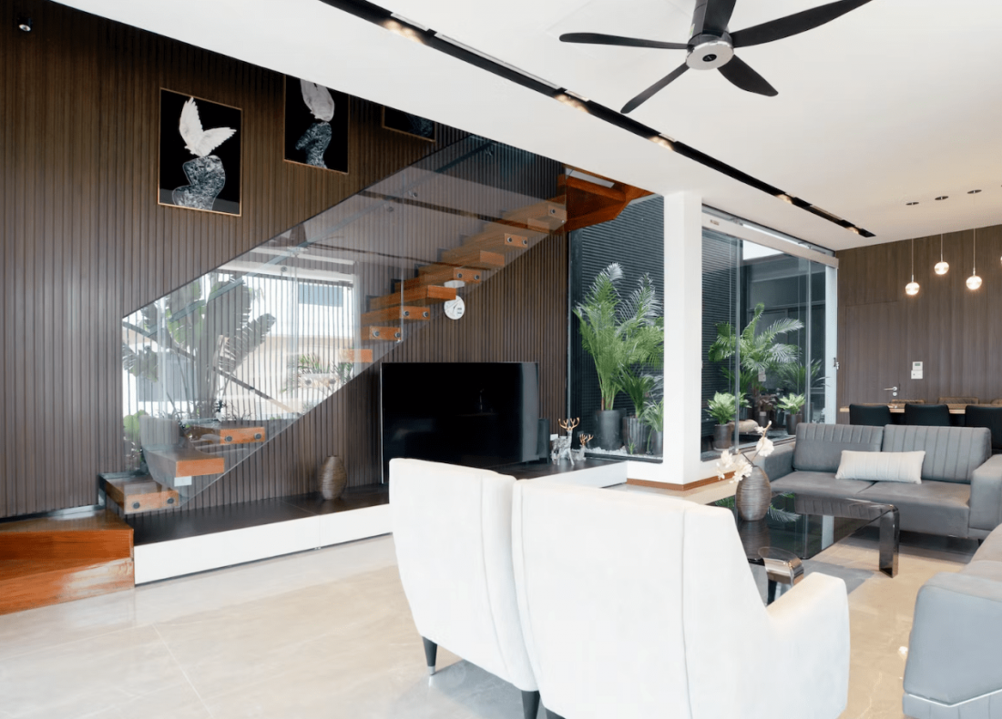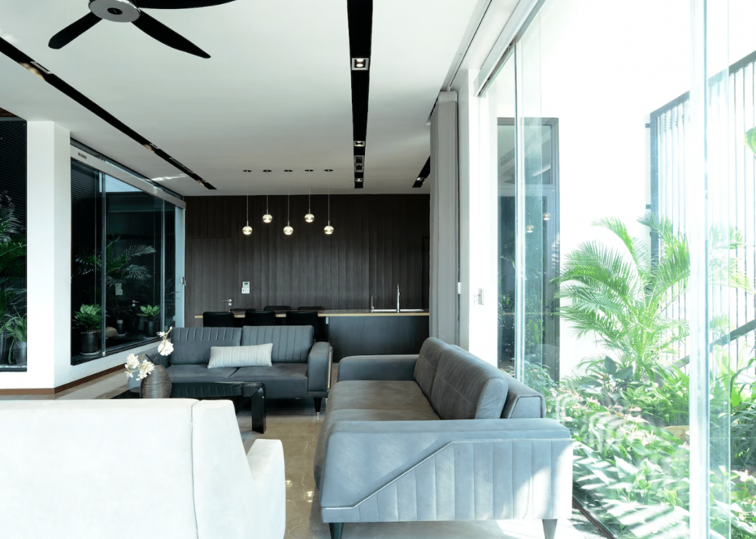 Đặc biệt, tại hướng Đông Nam là bộ ba giếng trời, cửa kính và thác nước trên mặt tường giúp không khí nóng trở nên mát mẻ.