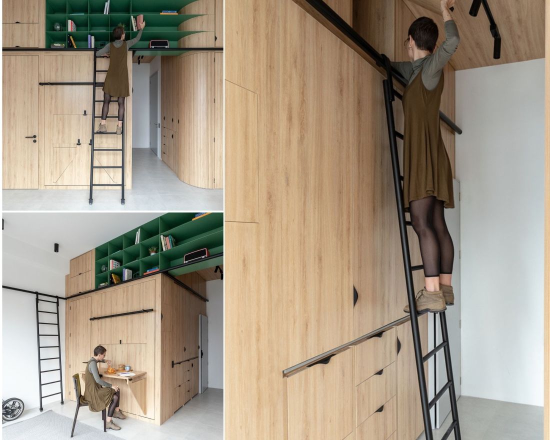 Phần 1 là khu vực lưu trữ đồ, các vật dụng được bố trí bên trên và phần còn lại là các tính năng mở liên quan đến hoạt động của gia chủ được sử dụng bằng nội thất xếp gọn dựa trên hệ khung gỗ cong.