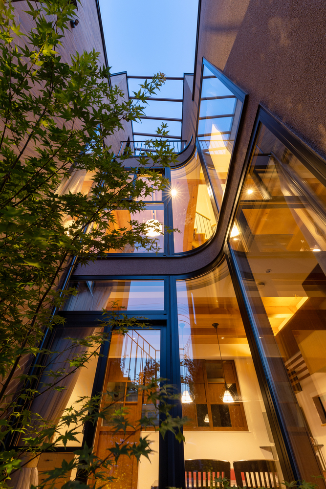 Mảng kính uốn cong hướng ra khu vườn nhỏ được kết hợp với nhôm giả gỗ tại mặt tiền giúp ngôi nhà trở nên mềm mại và có thể nhìn thấy trực tiếp những tia nắng và ánh sáng thay đổi trong ngày.