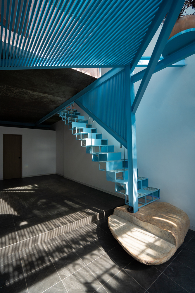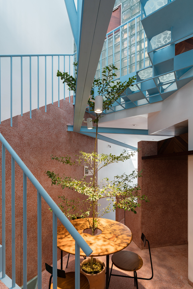 Mặt tiền, hệ cầu thang và khung thép chịu lực đều sơn màu xanh lam hài hòa với các không gian bên trong ngôi nhà 3 tầng trong hẻm của hai mẹ con hướng đến sự tự do tại Vĩnh Long.