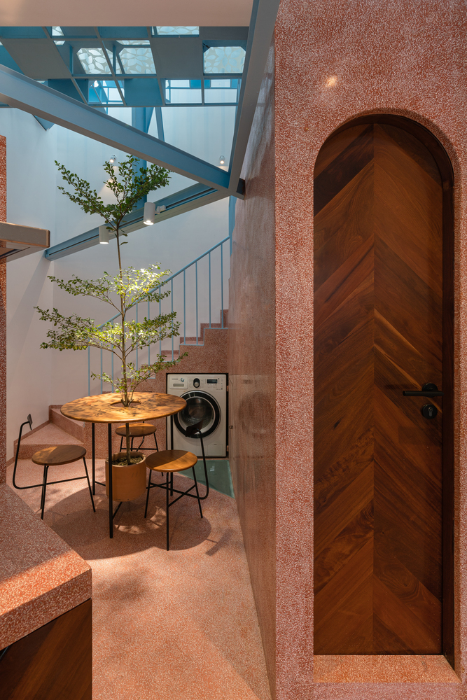 Để giải quyết nhược điểm trên mảnh đất nhỏ, kiến trúc sư đã lên kế hoạch thiết kế kết hợp nhiều chức năng thành một. Cây không chỉ đóng vai trò kết cấu, mà còn là chiếc cầu thang, khoảng giao thông chiếu nghỉ đủ cho các chức năng phụ như mái hiên, giặt phơi.