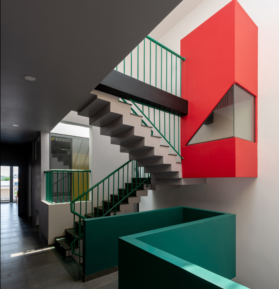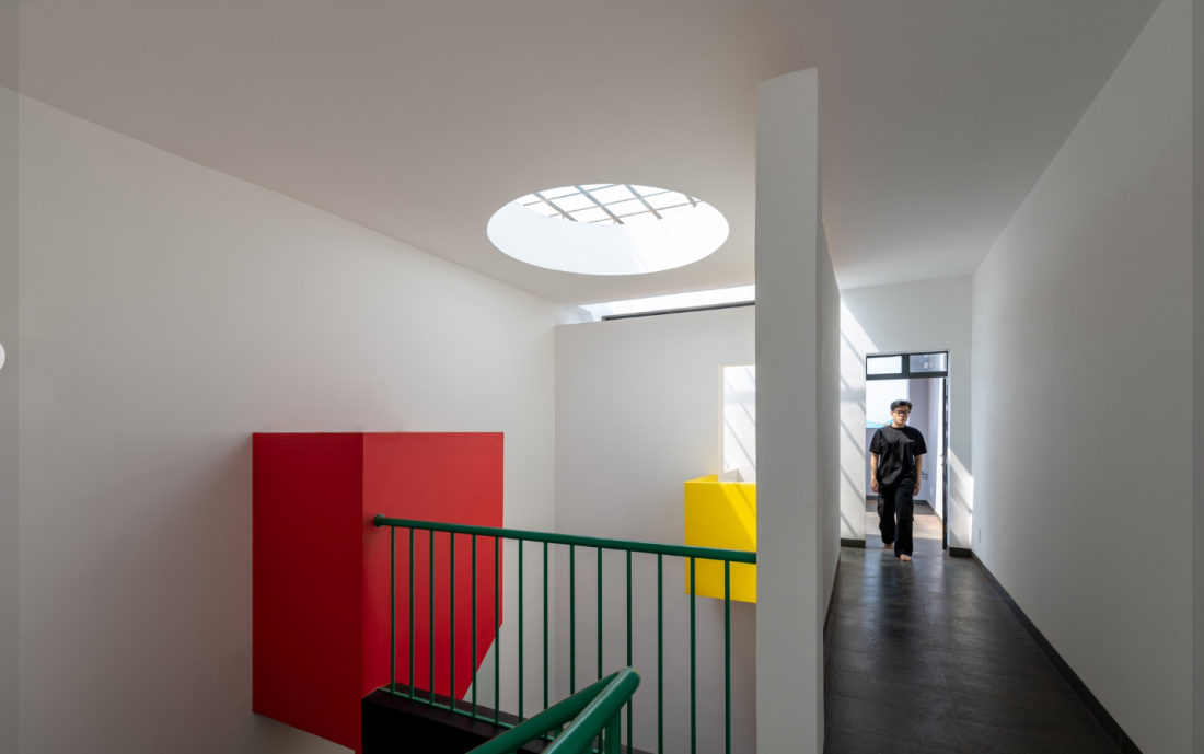 Điểm nhấn độc đáo nhất chính là giếng trời hình tròn trên mái. Ánh sáng từ đây len lỏi qua các khối hình học màu đỏ, vàng, xanh lam, tạo nên những vệt sáng rực rỡ chiếu xuống các tầng. Không chỉ đẹp mắt, những góc màu sắc này còn là nơi vui chơi lý tưởng, khơi gợi trí tưởng tượng cho trẻ nhỏ trong tương lai.