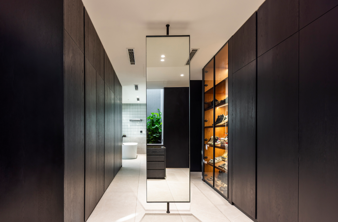 Phong cách hiện đại, sang trọng, tông màu trắng đen là biểu hiện đặc trưng của phòng thay đồi nói riêng và ngôi nhà nói chung. Tiện nghi nhưng không bỏ quên yếu tố cá tính, cảm xúc thư thái và riêng tư.