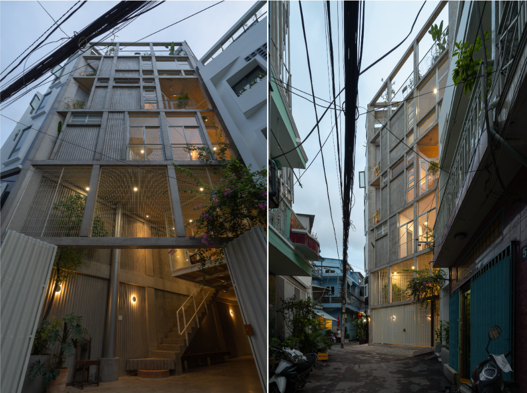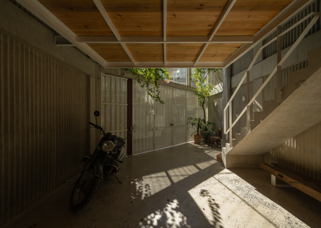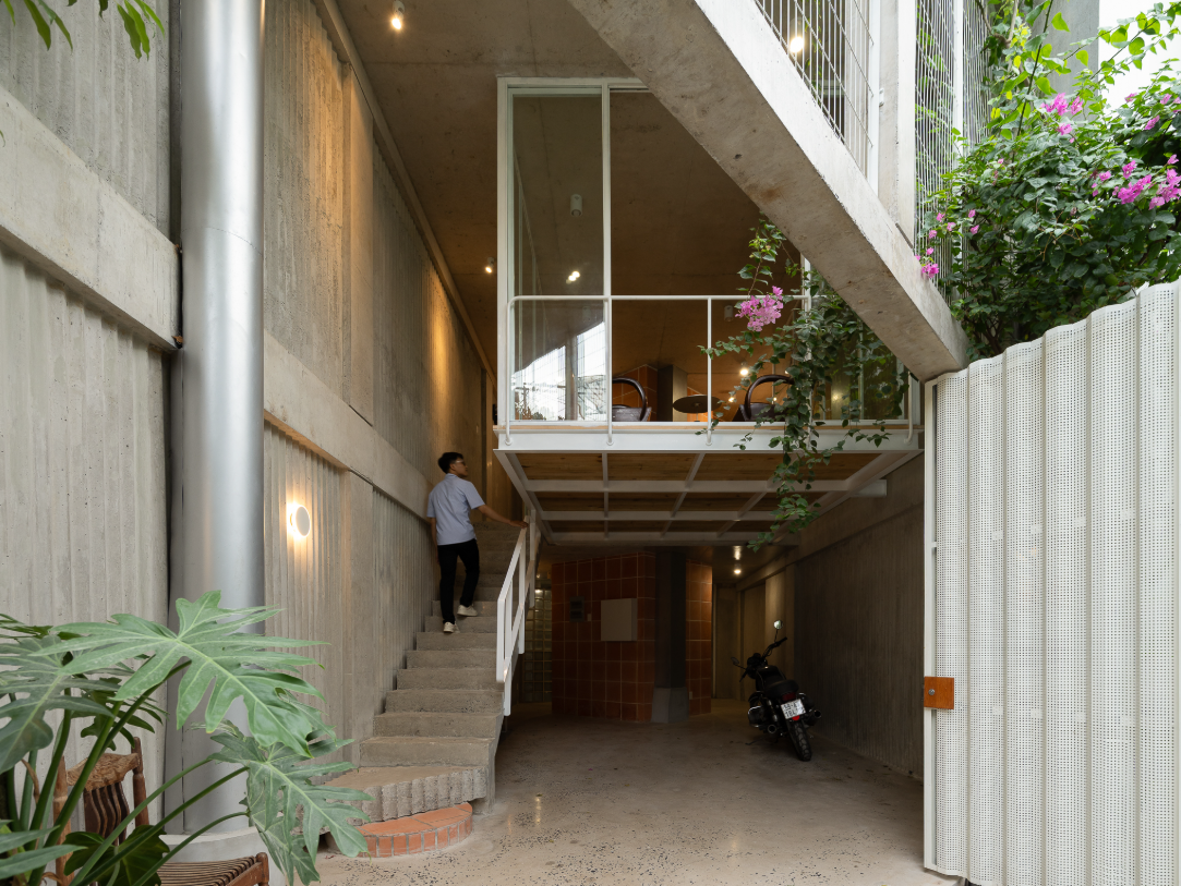 Để biến ngôi nhà thành một không gian đa năng, kiến trúc sư đã áp dụng những chiến lược thiết kế táo bạo. Tầng trệt và tầng lửng: Hai tầng này được giữ lại với không gian mở tối đa, hạn chế vách ngăn, tạo ra một sự chuyển tiếp liền mạch từ con hẻm vào trong nhà. Cổng và cửa lưới thép tăng cường sự trong suốt, làm mờ ranh giới giữa ngôi nhà và con hẻm, mời gọi mọi người bước vào.