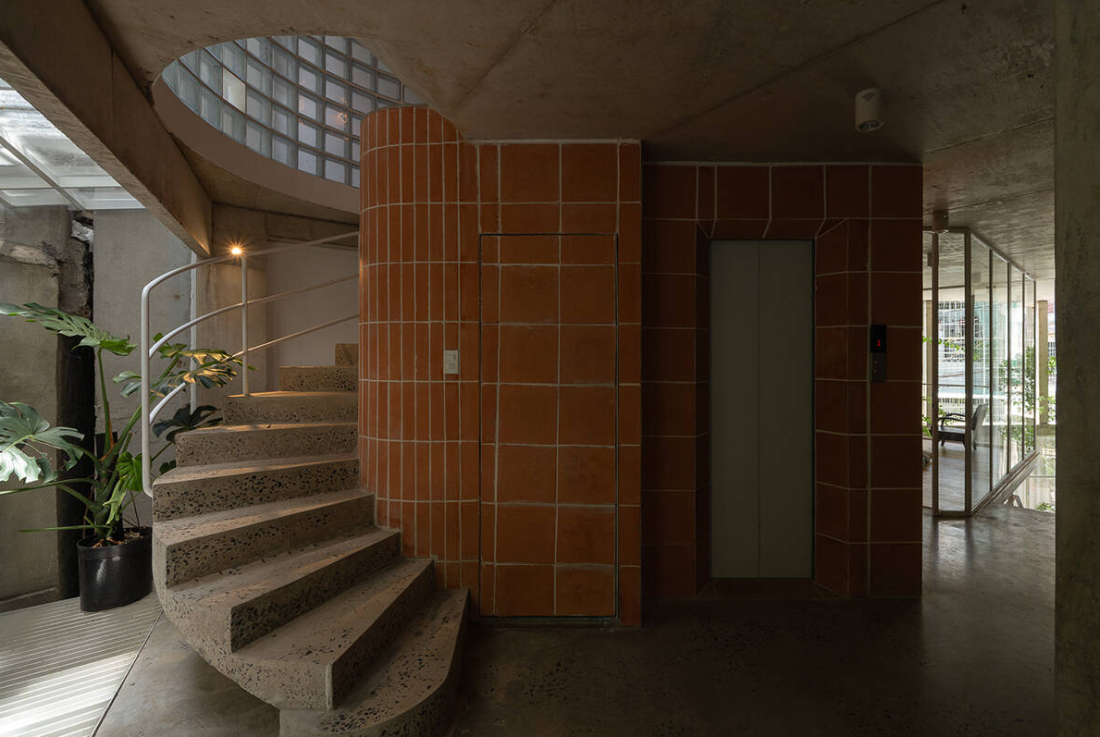 Hệ thống thang máy: Lõi thang máy được thiết kế như một tác phẩm điêu khắc, nổi bật giữa giếng trời. Tuy nhiên, nó không chỉ mang tính thẩm mỹ mà còn là một phần cấu trúc chịu lực quan trọng. Những bức tường kéo dài từ lõi thang máy tạo thành các hốc tam giác độc đáo, được sử dụng làm loggia, nhà vệ sinh, góc trồng cây hoặc giếng trời dọc.