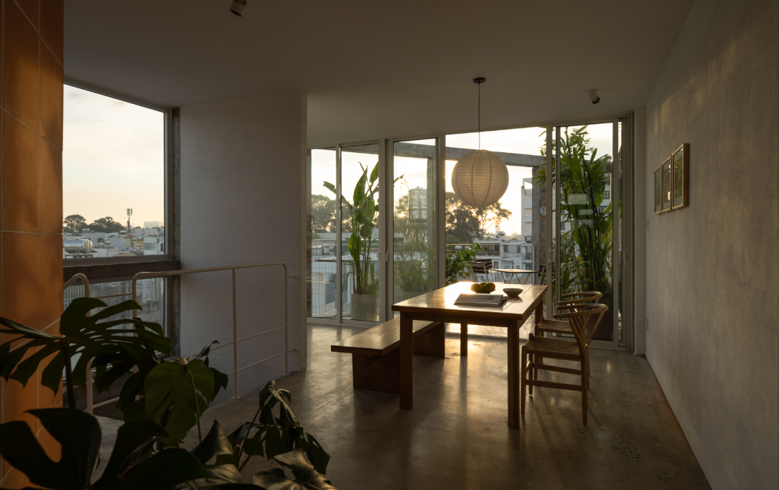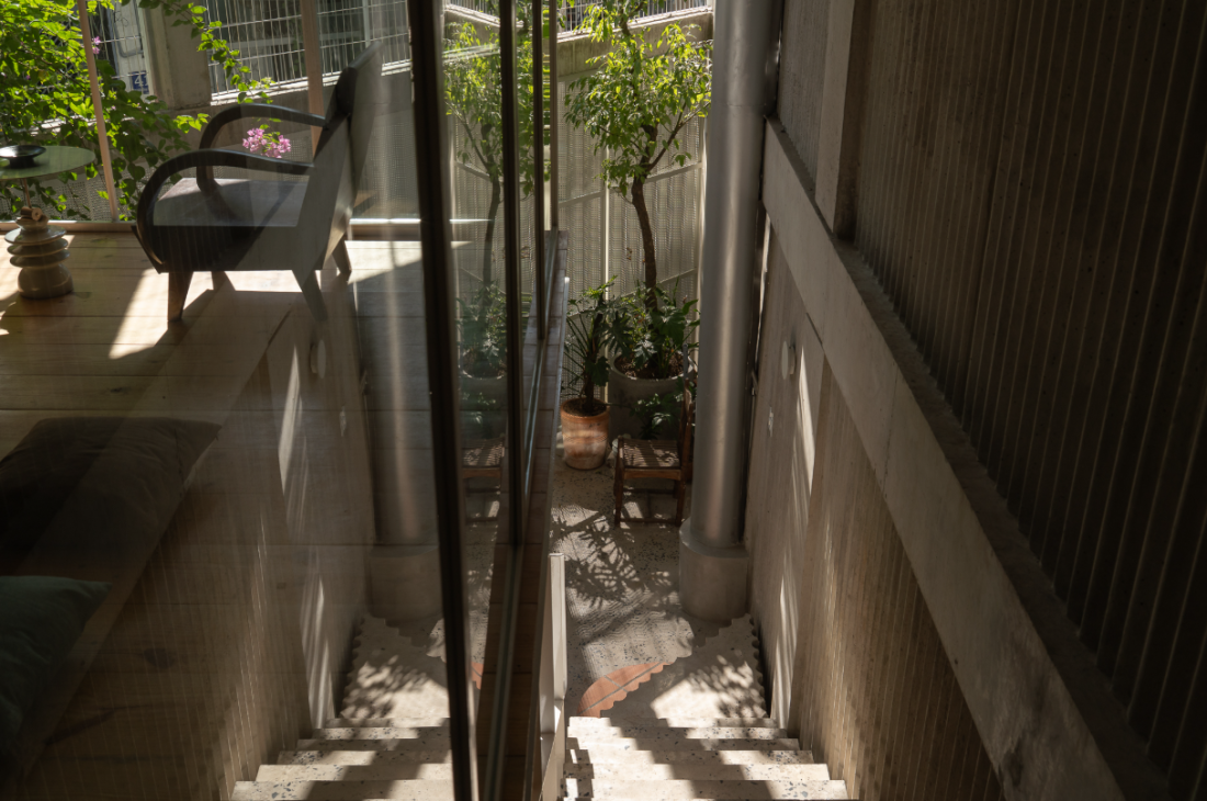 Hành lang cũng được thiết kế như những không gian bán công cộng, vừa tăng cường luồng không khí và sự thông thoáng, vừa mở rộng không gian cho các căn hộ. Đây là nơi cư dân có thể tiếp khách, đọc sách hoặc thư giãn trong một khu vườn giữa tầng.