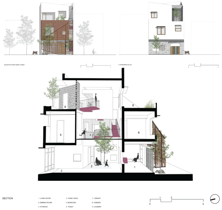 Vì ngôi nhà có 3 thế hệ nên các sinh hoạt hằng ngày của các thành viên được gói gọn trong không gian có sự kết nối xung quanh khoảng thông tầng bên dưới là cầu thang, giữa thiên nhiên trong và ngoài nhà. Yêu cầu đơn giản nhưng thật khó để cân bằng cuộc sống trong nhịp hối hả của thành phố hiện đại ngày nay.