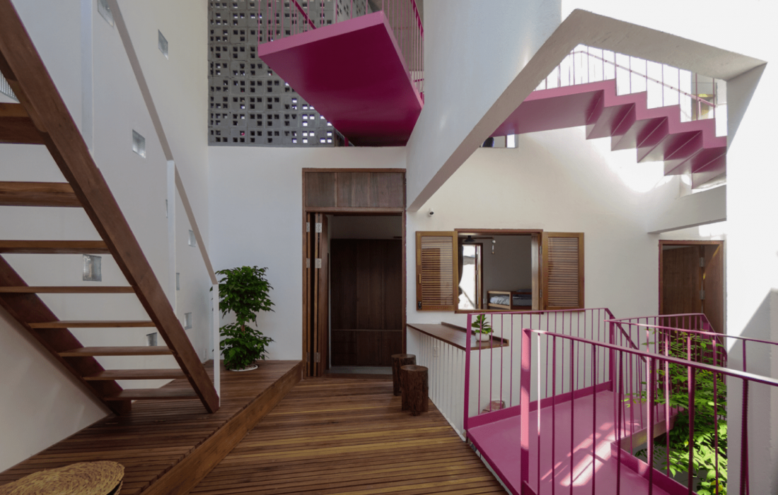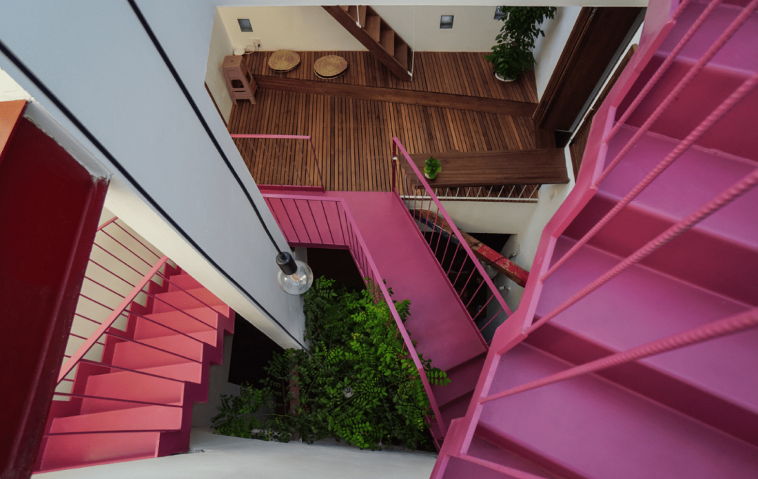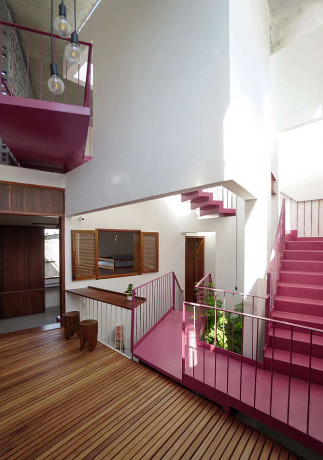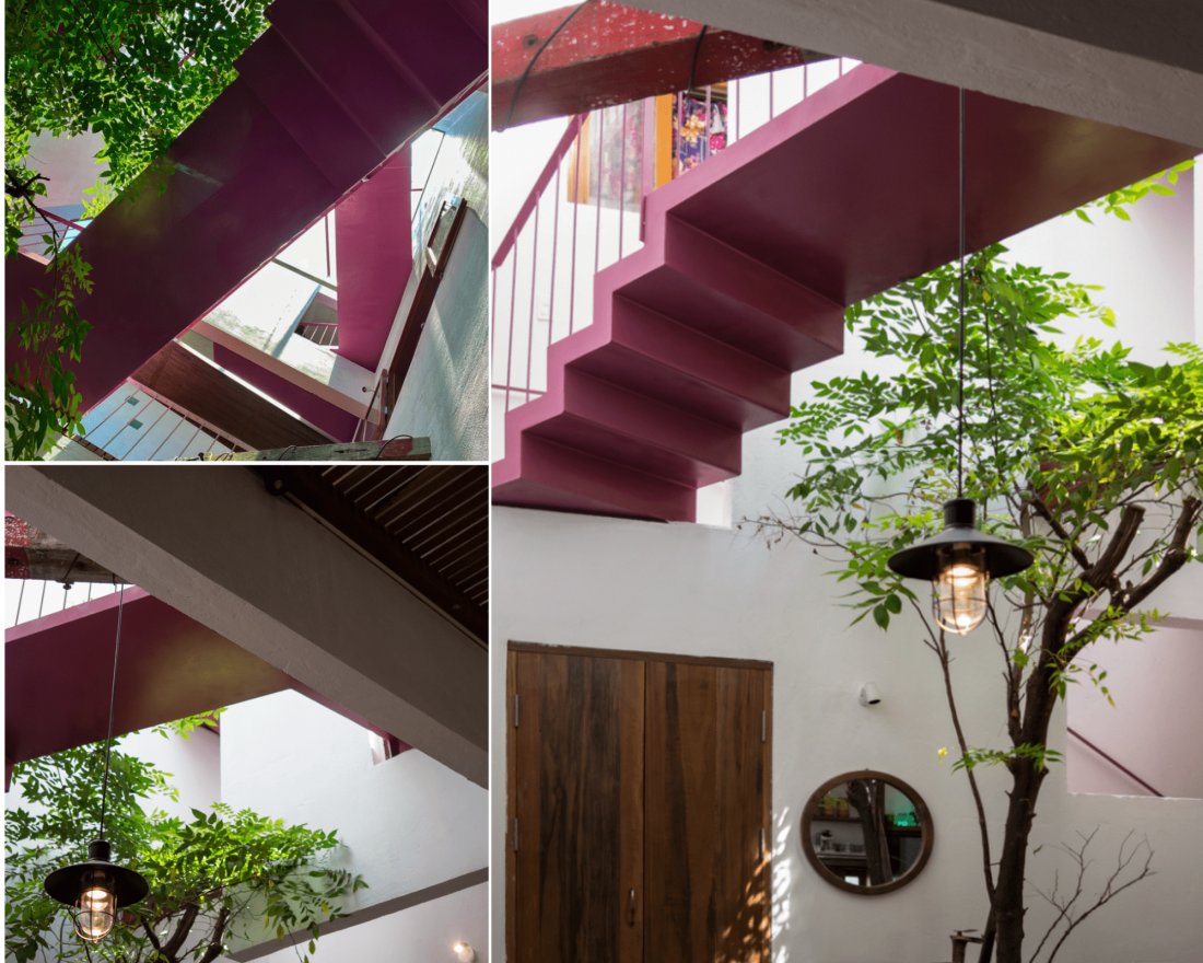 Khoảng thông tầng từ trên nhìn xuống có cây mọc thẳng vươn cao, chạy xung quanh là cầu thang xoắn ốc tông hồng nổi bật.