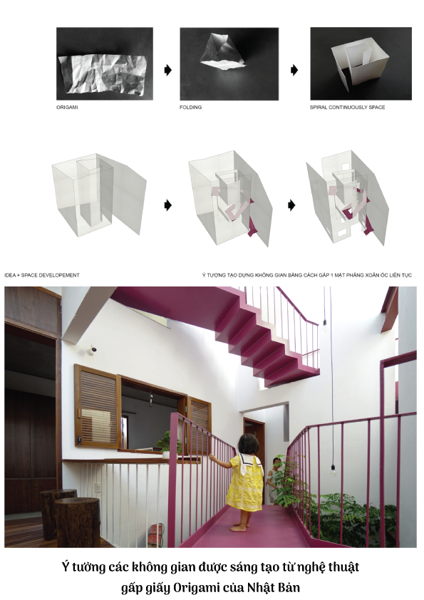 Lấy cảm hứng từ nghệ thuật Origami của Nhật – cũng ít nhiều ảnh hướng đến văn hóa và kiến trúc của Hội An, kiến trúc sư đã khéo léo đưa các không gian chức năng lùi vào giữa nhà, đó là sân trong – một nét kiến trúc gần gũi, quen thuộc của người dân sống tại Đà Nẵng.