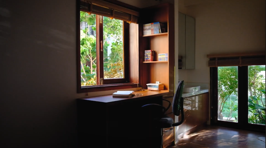 Phòng ngủ của bố mẹ tại tầng trệt. từ đây có thể phóng tầm mắt ra sân nhỏ và khoảng thông tầng đối lưu ánh sáng.