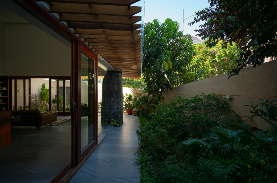 Hệ thống đệm nhiệt: Các sân trong được trồng cây xanh và các khối phụ trợ được bố trí để cách nhiệt cho các phòng ngủ. Các khoảng thông tầng dọc và vùng đệm cây xanh còn giúp điều hòa hiệu suất nhiệt cho khu vực sinh hoạt.