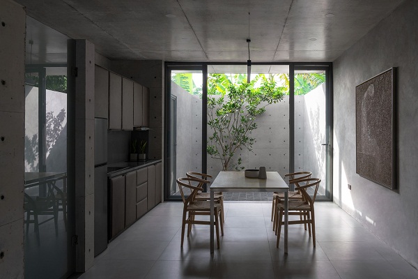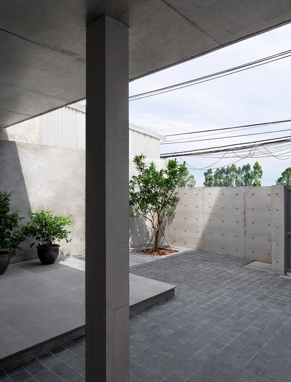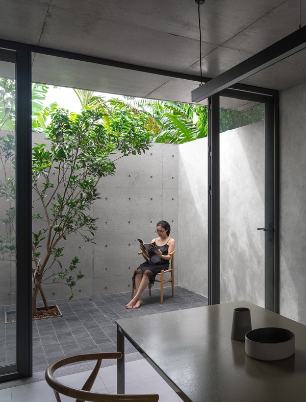 Vì ngôi nhà nằm ở khu vực có khí hậu nhiệt đới gió mùa ẩm ướt nên kiến trúc sư sẽ hướng đến yếu tố thoáng mát và gió tự nhiên. Giải pháp là bố trí hai khoảng sân cho ngôi nhà, sân trước và sân sau để giúp không khí lưu thông dễ dàng qua không gian sống.