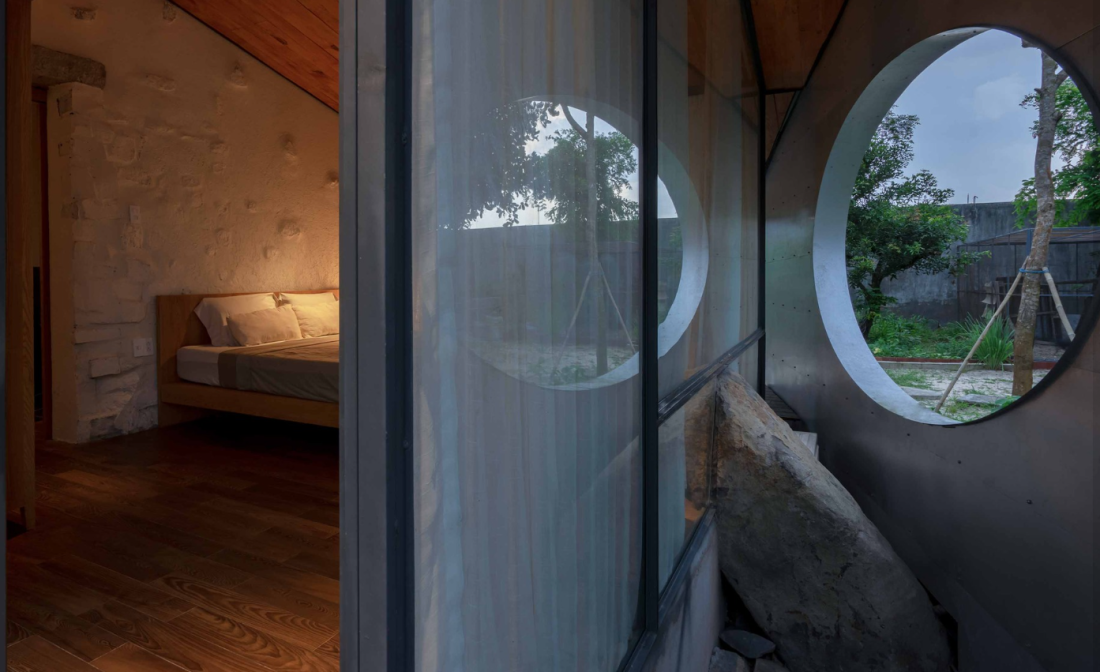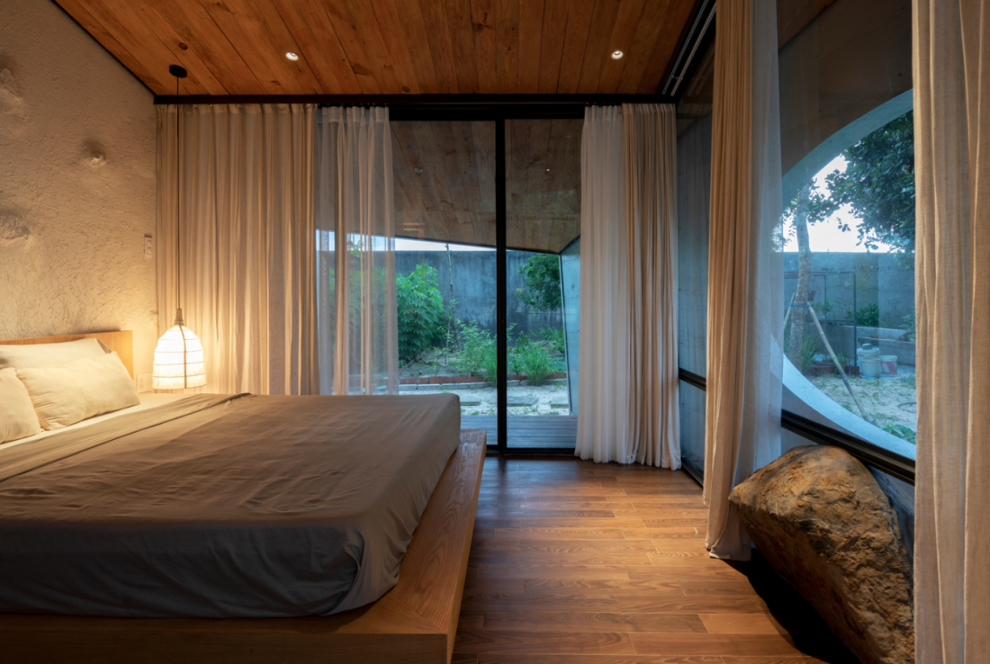 Phòng ngủ được sắp xếp theo chiều dọc: phòng ông bà ở phía trước, cha mẹ ở giữa, và trẻ ở cuối cùng. Tất cả đều nằm dưới một mái nhà liền mạch, mở ra đón nắng, gió và hơi thở của biển. Phòng của bọn trẻ là một thế giới riêng – cửa sổ lớn nhìn ra rừng, nơi chúng có thể mơ mộng và sáng tạo. Còn phòng ông bà lại yên bình, gần gũi với khu vườn nhỏ bên dưới.