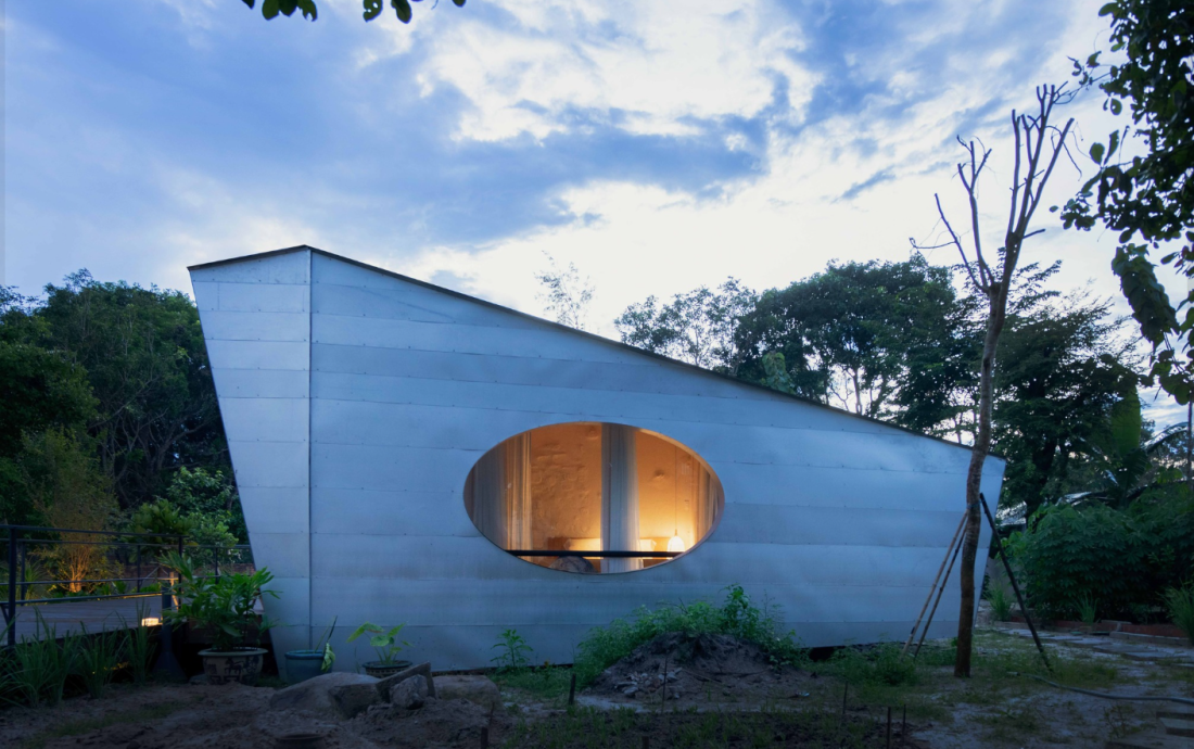 Mái nhà bằng kim loại nhẹ, hình dáng như một chiếc lều khổng lồ. Mái này không chỉ che phủ ngôi nhà mà còn mở rộng ra một hiên nhà rộng rãi – nơi cả gia đình qua tụ họp, trò chuyện hay đơn giản là ngồi ngắm biển.