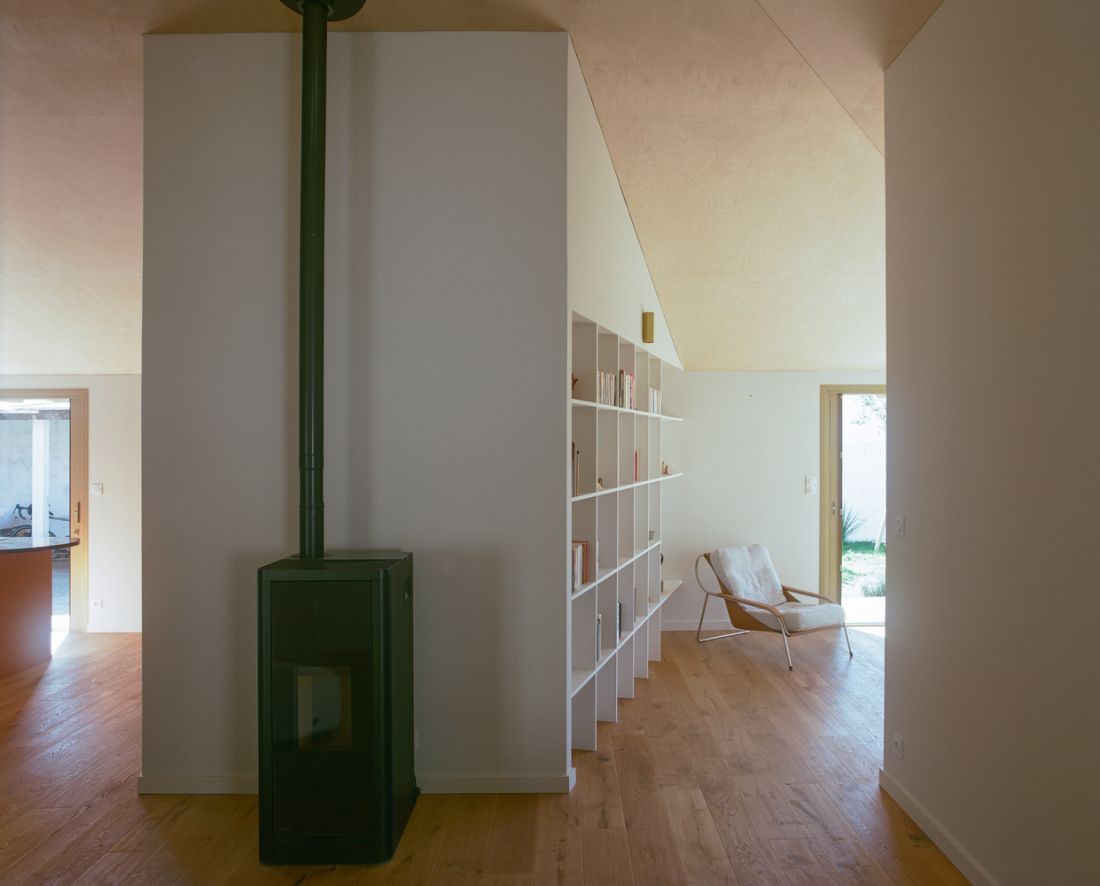 Lò sưởi được bố trí tại trung tâm nhà để có thể truyền lượng nhiệt đến tất cả các phòng. Phần mái chính giữa nhà, kiến trúc sư bố trí 2 giếng trời để cung cấp ánh sáng vào ban ngày với mục đích thay cho bóng đèn để tiết kiệm điện năng.