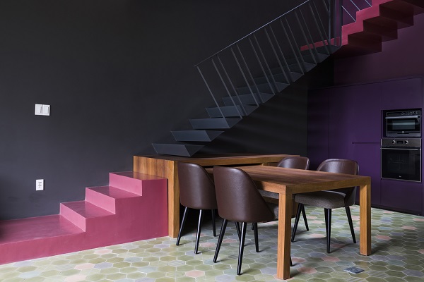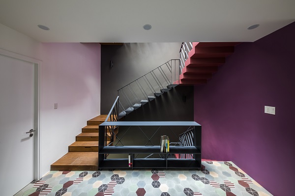Theo như kế hoạch, cần có 4 phòng ngủ với một phòng ở tầng trệt, nhưng mặt bằng thực tế bị hạn chế. Giải pháp là kiến trúc sư đã thiết kế cầu thang trở thành điểm nhấn, thu hút sự tập trung nhất bên trong, đó là một thiết kế đặc biệt chia làm 3 phần, phần bậc thang là ngăn kéo gỗ, phần bậc thang bằng sắt sơn tĩnh điện và phần bậc thang bê tông màu tím.