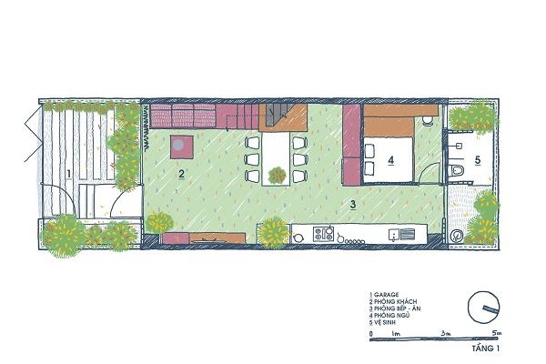 Ngôi nhà nằm ở phía Tây TP Hồ Chí Minh được xây dựng trên miếng đất có diện tích 5m x 15m, cũng là một công trình điển hình về nhà ở thương mại hay nhà ống tại các thành phố lớn, khu dân cư sầm uất, vốn là những loại nhà thường thiếu ánh sáng mặt trời, cảm giác như đang bị giam cầm.