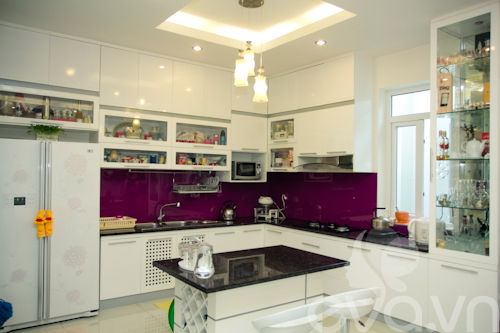 Không gian bếp được thiết kế ấm cúng với sự kết hợp của màu trắng - tím cùng ánh đèn lung linh trên trần.
