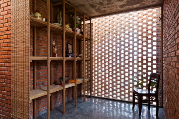 Thiết kế đặc biệt của các bức tường gạch nung với nhiều lỗ cùng với không gian thông tầng lớn, giúp thông gió và đưa ánh sáng vào từng không gian trong căn hộ.