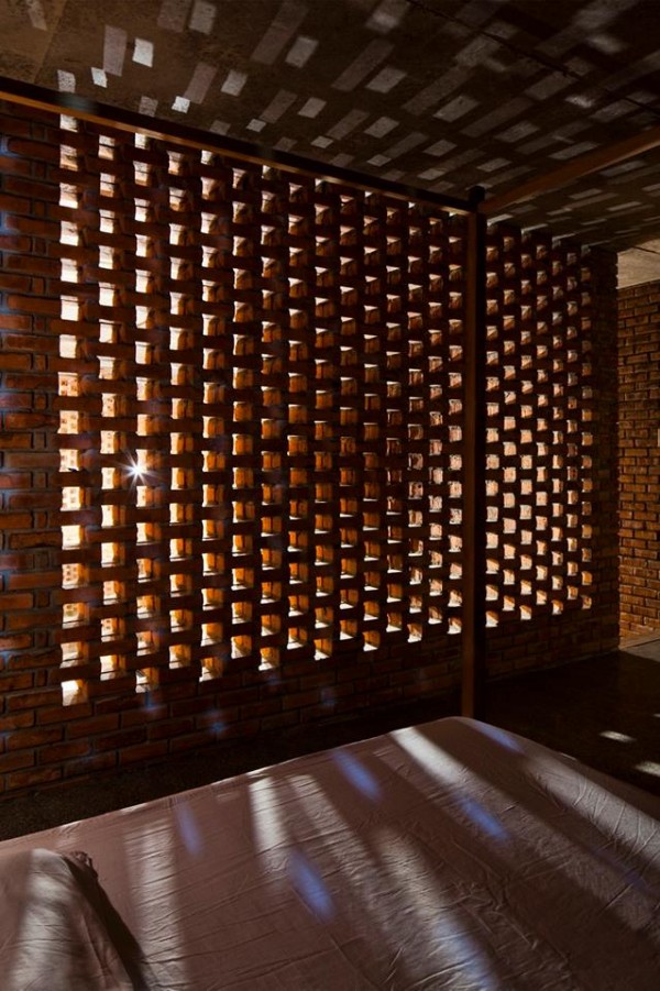 Phòng ngủ được bố trí ở cả tầng trệt và tầng trên của ngôi nhà. Các không gian chuyển tiếp như hành lang, vách ngăn được làm bằng gạch nung, sắp xen kẽ để tạo nên những lỗ thông gió và ánh sáng.