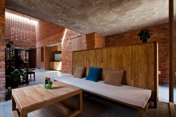 Nội thất giản dị với gỗ và gạch nung.