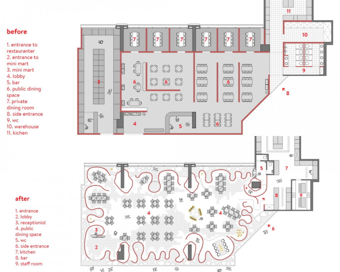 Mặt bằng cải tạo trước và sau nhà hàng chay mang đậm tinh thần Phật giáo ngay giữa lòng Hà Nội.