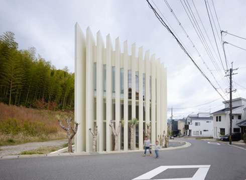 Phía trước ngôi nhà là khúc cua của một con người. Căn nhà có hình dáng cong cong của cánh cung, thiết kế xếp lớp như chiếc quạt.