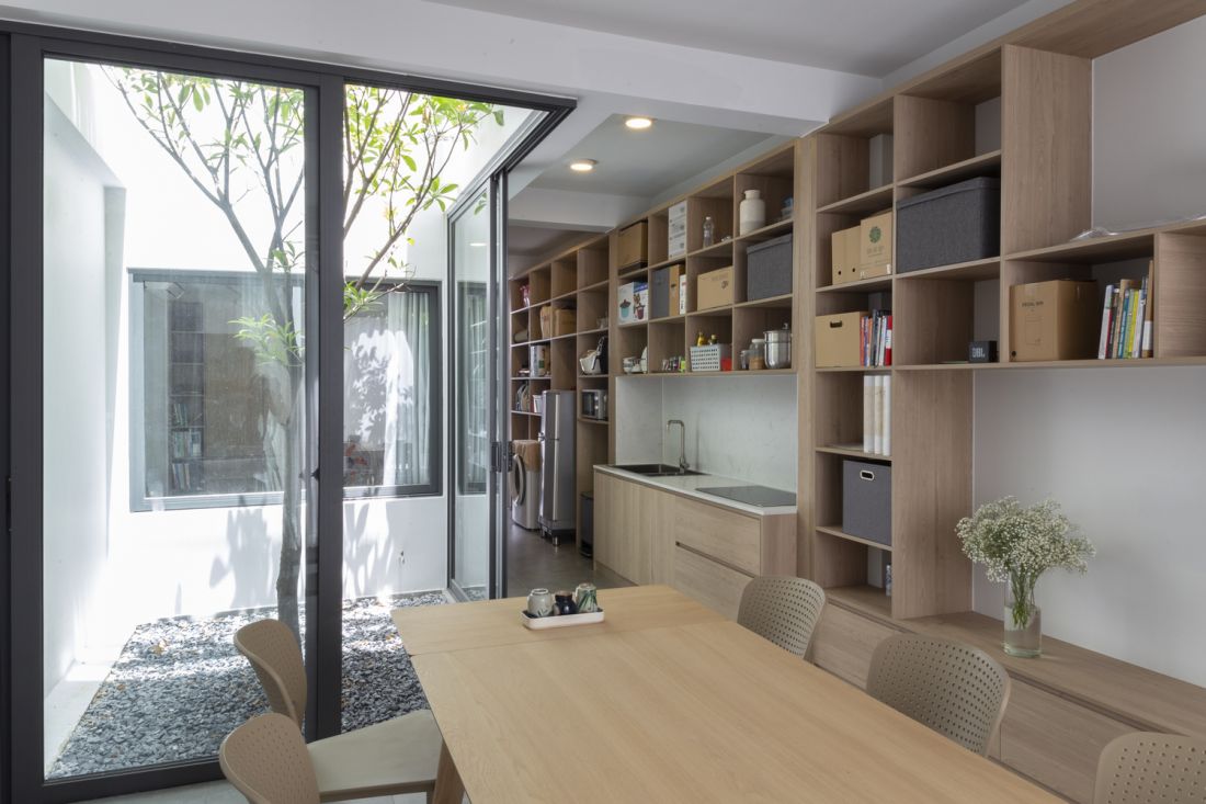 Tính hướng nội – Không giống như các nhà phố thông thường tại TP. HCM, ngôi nhà có hai mặt tiền, trước sau chỉ mở vừa đủ để đón ánh sáng ban ngày và thông gió để tránh tiếng ồn và ô nhiễm không khí, đồng thời duy trì sự riêng tư và thân mật cho gia chủ.
