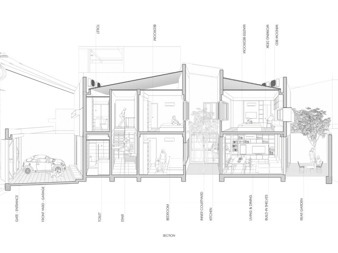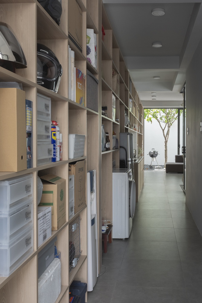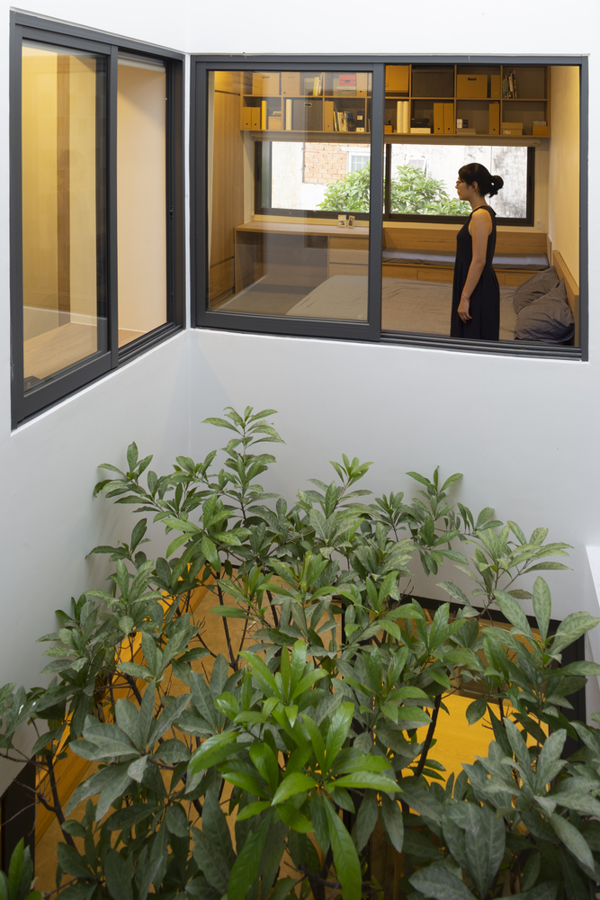 Cầu thang và nhà vệ sinh được bố trí ở phía trước nhà để nhường chỗ cho sân trong, đây cũng là trung tâm của ngôi nhà. Còn bếp và phòng khách và phòng ngủ được bố trí giữa hai sân trong tạo sự thông thoáng, có thể nhận đủ ánh sáng.