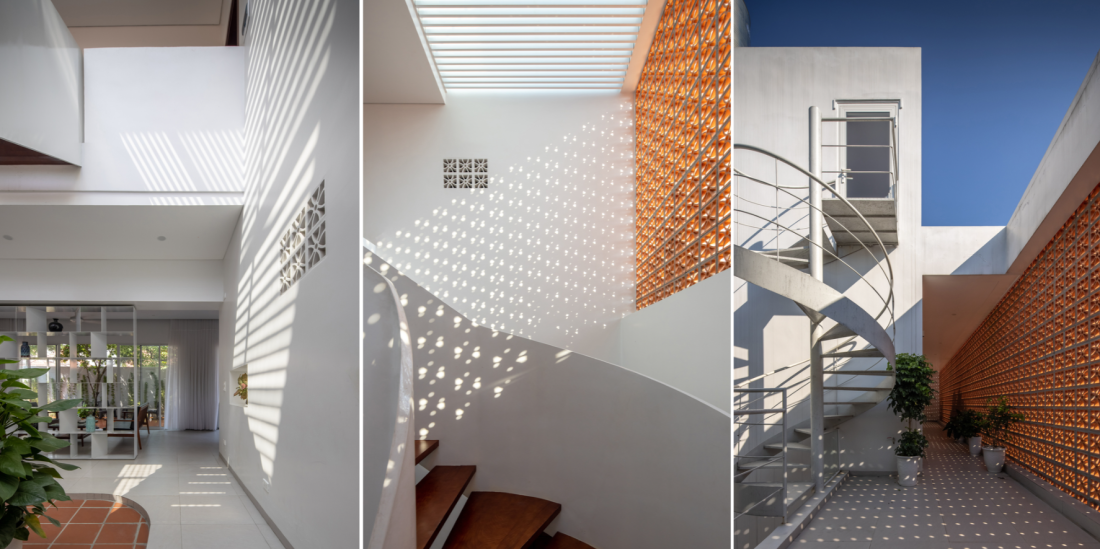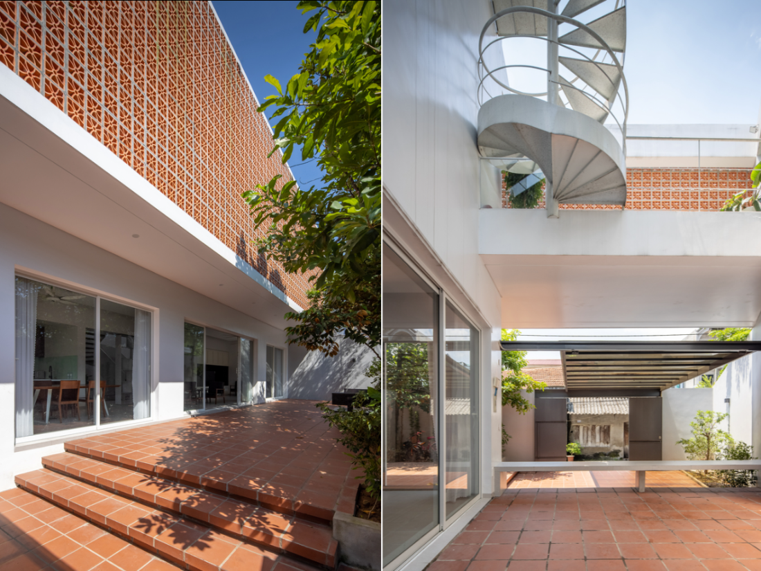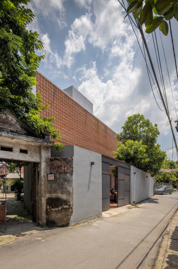 Mặt tiền nhà hướng Tây sử dụng kệ tường gạch lỗ chắc chắn kết hợp tường bê tông chịu nắng gắt và khói bụi từ xe cộ.