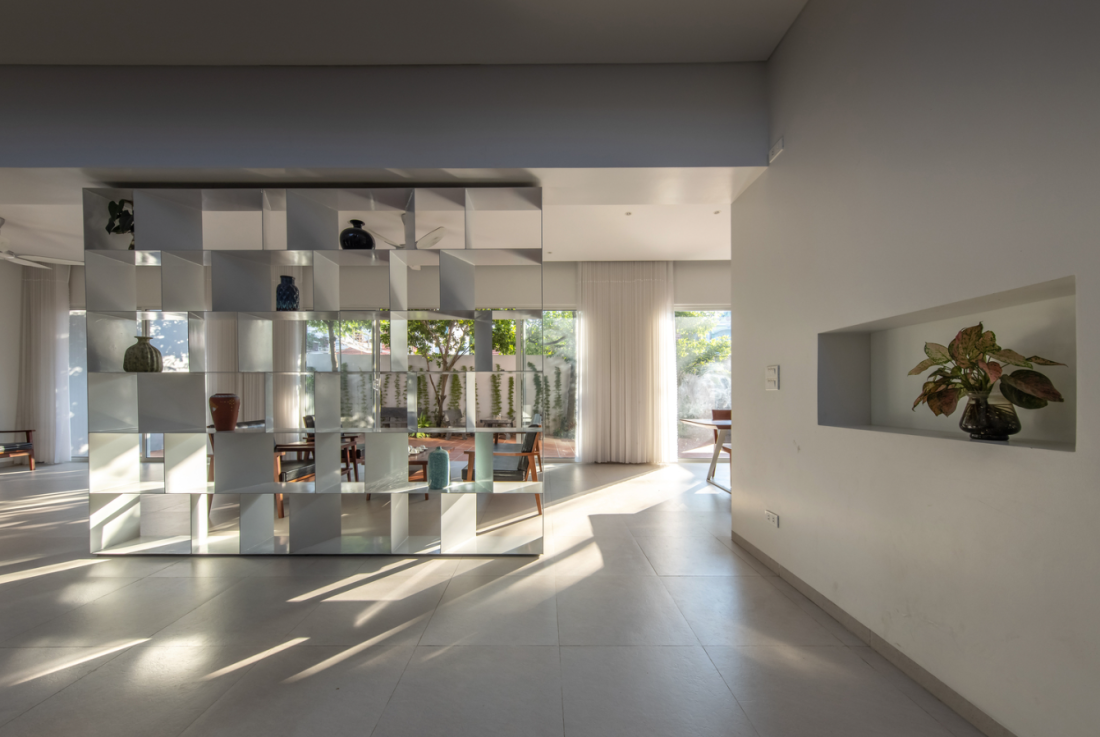 Gam màu chủ đạo là trắng kết hợp với kệ trang trí khiêm vách ngăn cùng màu làm không gian thêm mở rộng và giúp ánh sáng có thể truyền mạch lạc.