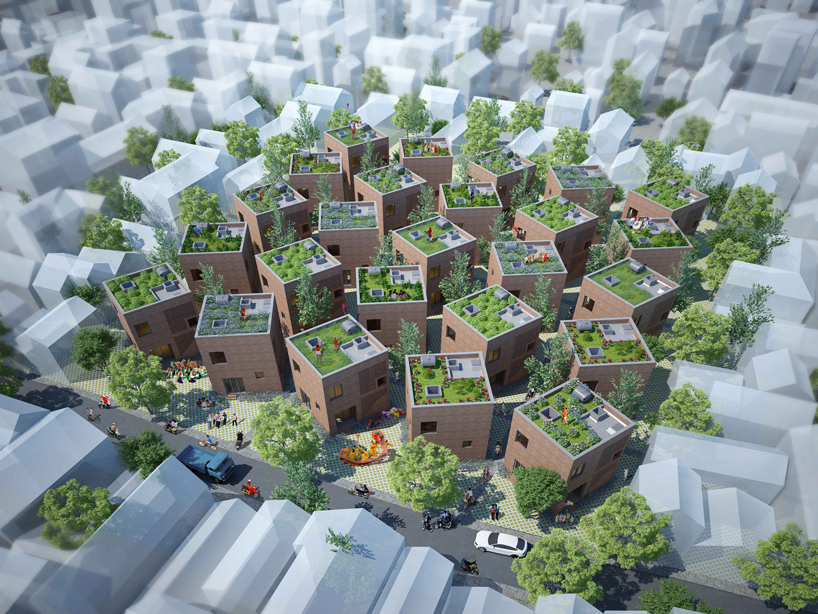 Giải pháp được đề xuất là lấy 1 phần diện tích từ một cánh đồng, bên trong phần diện tích này chính là ngôi nhà được xây thành khối lập phương, mỗi hướng của ngôi nhà có những lỗ kết nối với phần không gian xanh đặt ở trên mái ngôi nhà.