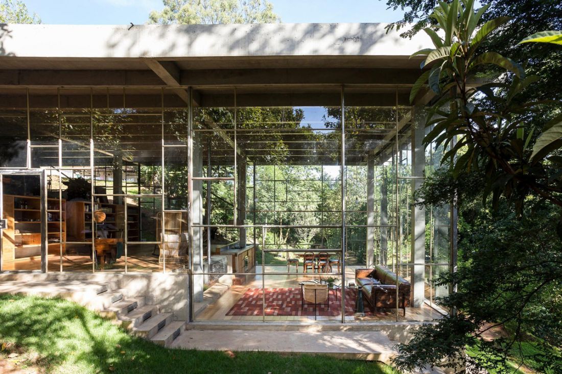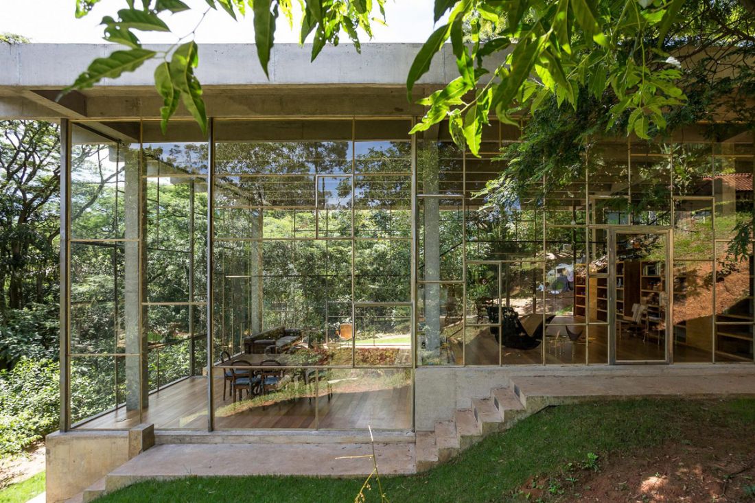 Toàn bộ bên ngoài nhà được bao bọc hoàn toàn bằng kính nên có thể nhìn xuyên từ bên này sang bên kia của ngôi nhà. Vì vậy cây xanh hòa cùng ánh nắng sẽ xuyên qua khiến ngôi nhà hòa vào không gian sống bên ngoài.