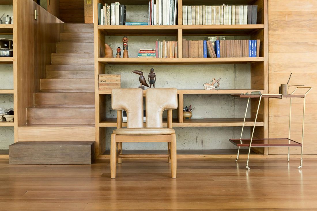 Các bậc thang bằng gỗ dẫn đến các tầng tiếp theo của ngôi nhà được thiết kế liền kề với một tủ sách bằng gỗ đặt làm riêng.