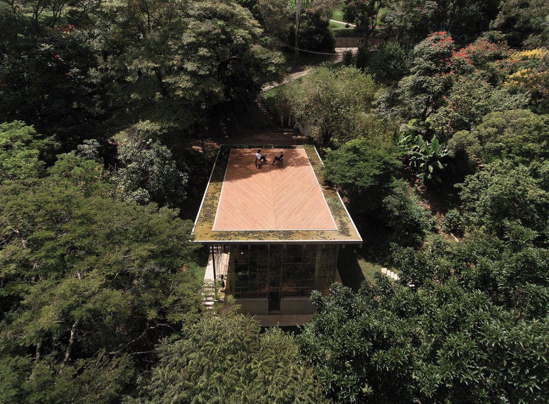 Ngôi nhà có cấu trúc bậc thang nhô lên trên ba mặt phẳng để phù hợp với khu đất ven đồi yên tĩnh tại thị trấn nhỏ Vinhedo, Brazil. Những hàng cây cao vươn mình đón nắng trong không gian xanh mướt bao quanh ngôi nhà.