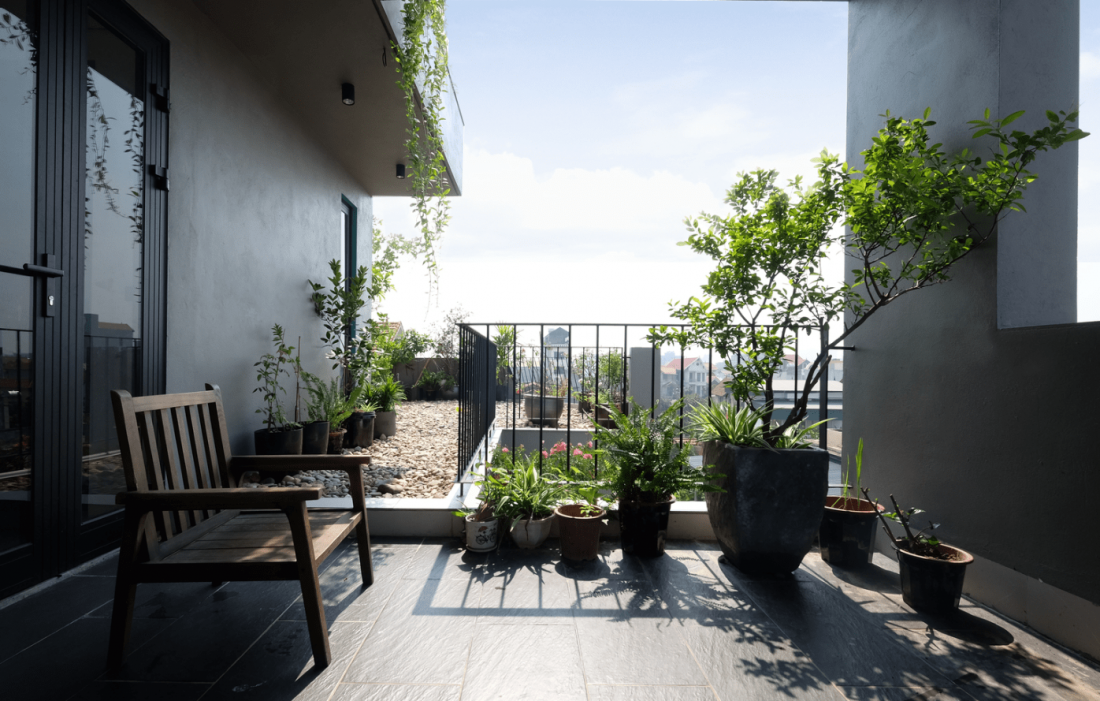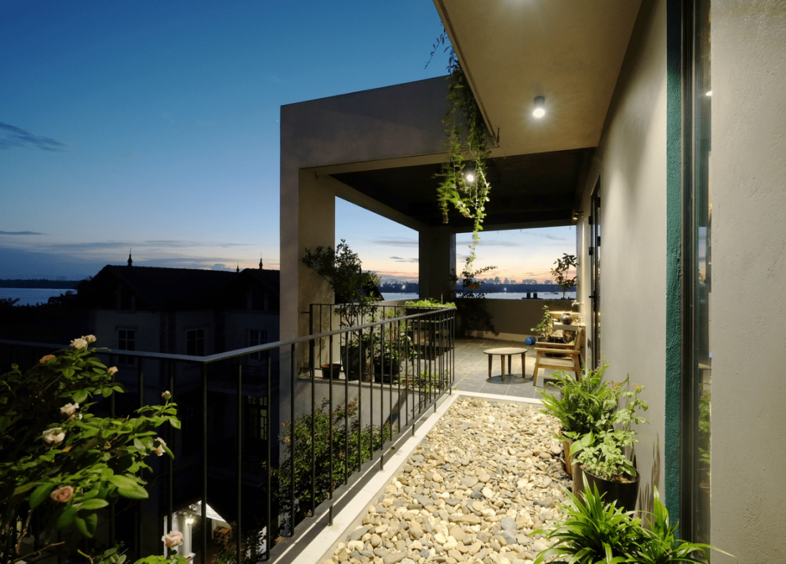 Về kết cấu, ngôi nhà thiết kế mái bằng với lớp đá cuội tự nhiên dày 20cm để tạo hiệu quả cách nhiệt cho kết cấu bên dưới, kết hợp với hệ thống làm mát giúp hạ nhiệt nhanh trên sân thượng.
