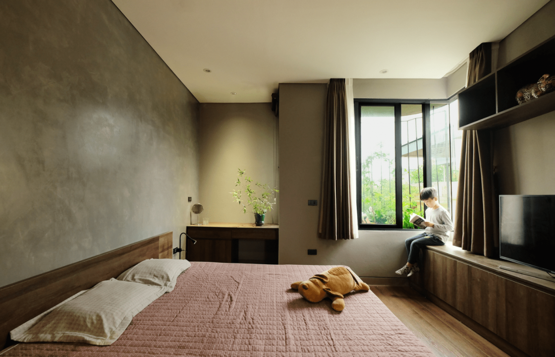 Tầng 2 gồm phòng ngủ chính và phòng trẻ được thiết kế đa chức năng, vừa có thể là không gian sinh hoạt chung của gia đình vừa là nơi học tập dành cho con. Tầng 3 gồm phòng thờ ngay trung tâm hướng nhìn ra ban công rộng nằm giữa phòng ngủ và phòng làm việc. Trong đó, khu vực phòng thờ được thiết kế hệ thống mành tre kéo xuống đơn giản vừa tạo sự riêng tư vừa thông gió tự nhiên.