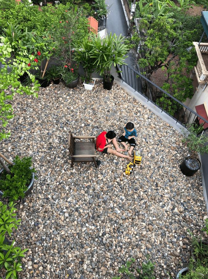 Sân thượng trải sỏi là nơi trẻ có thể vui chơi, tham gia các hoạt động tương tác như trồng, chăm sóc cây xanh và các trò chơi sáng tạo nhằm giúp chúng xa rời với những thiết bị điện thoại thông minh, tivi…