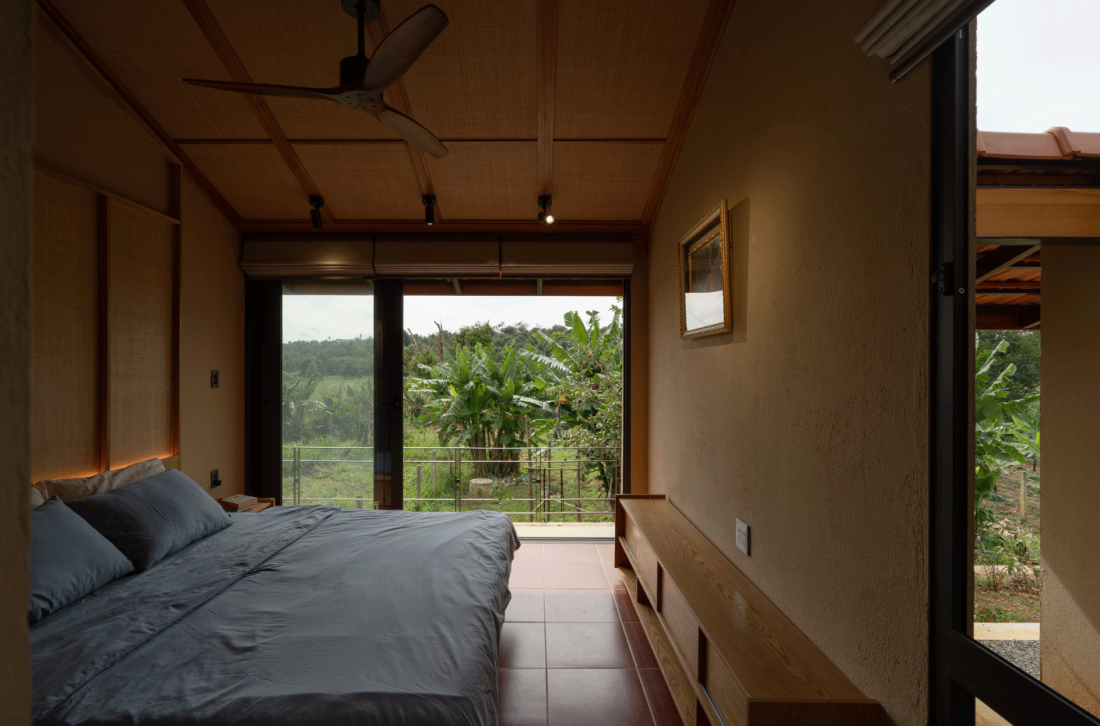 Bên trong phòng ngủ Master bố trí đồ nội thất vừa đủ, tường quét vôi, cửa kính lớn tối đa ánh sáng, gió, che nắng bằng màn tre và màn cuốn, thay điều hòa bằng quạt trần.
