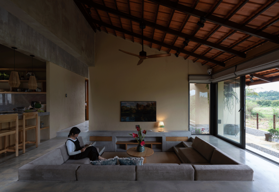 Phòng khách hạ sàn, không cần sofa, chỉ cần những tấm đệm dày đặt sát bậc bê tông, khiến không gian thoáng và linh hoạt hơn.