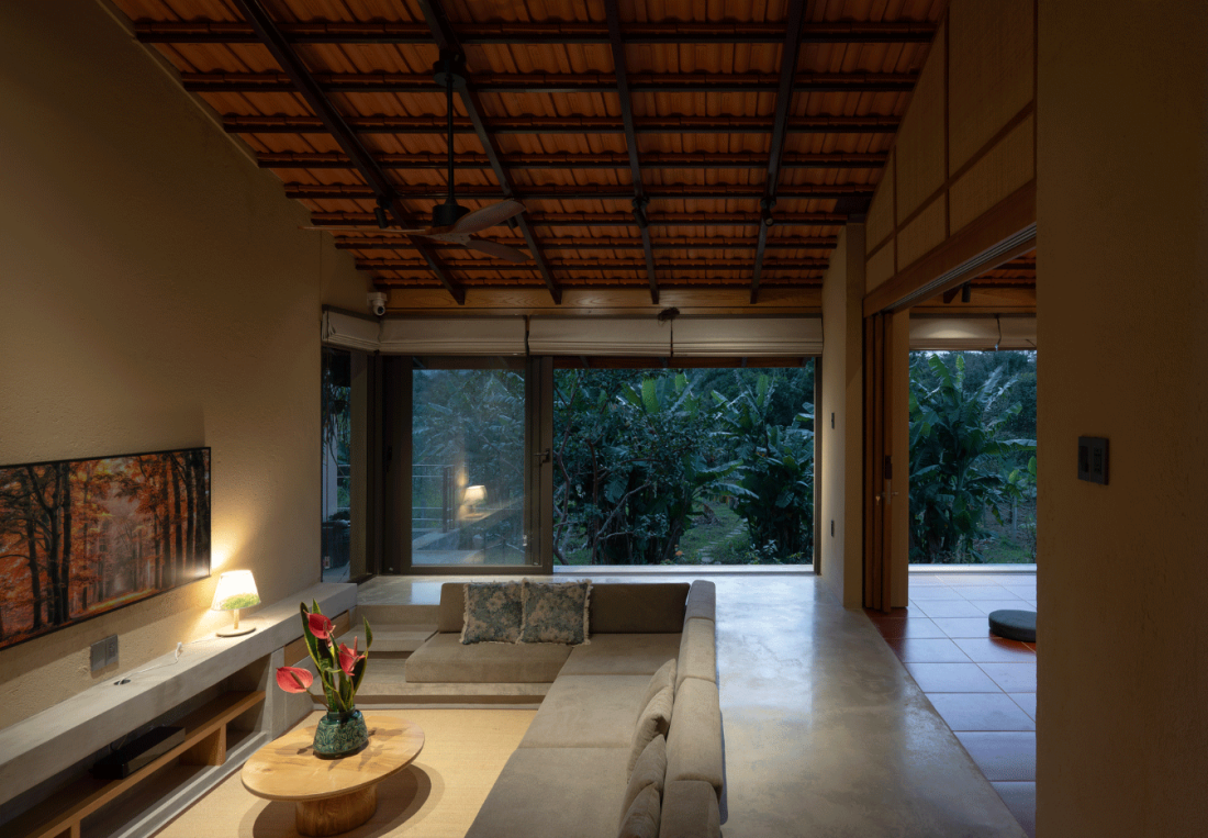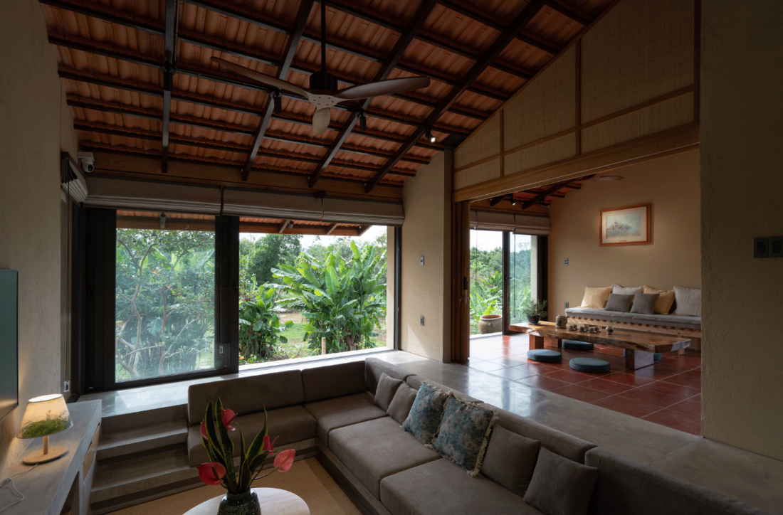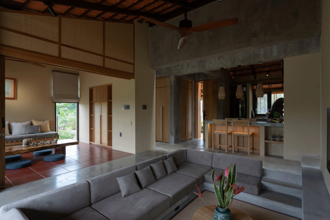 Các không gian đệm như hiên nhà và sân vườn đóng vai trò quan trọng trong việc nới rộng diện tích sử dụng. Đây là nơi ranh giới giữa trong và ngoài hoàn toàn biến mất, nơi gia chủ có thể cảm nhận được hơi ẩm của đất sau cơn mưa hay tiếng gió xào xạc từ bờ sông thổi vào.