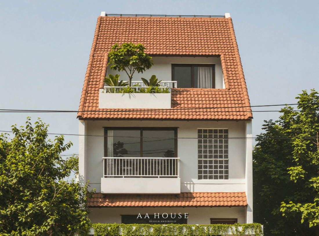 Ngôi nhà hòa vào cảnh quan xung quanh bằng mái ngói đất nung đỏ truyền thống, tường trắng và mái ngói đỏ dốc mềm mại theo hình thái tự nhiên của khu đất. Chiều cao của khối nhà giảm dần về phía sau, tạo ra một hình bóng khiêm tốn, tĩnh lặng, đồng thời duy trì sự riêng tư cho không gian bên trong.