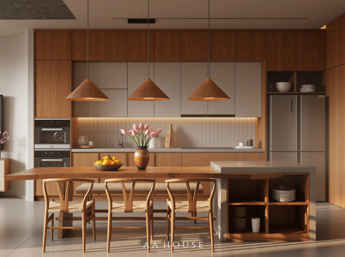 Không gian bếp và bàn ăn bài trí trở thành một khu vực đầm ấm. bộ bàn ăn gỗ kết hợp giữa ghế nhẹ và băng ghế bọc vải trung tính tạo cảm giác thân mật.
