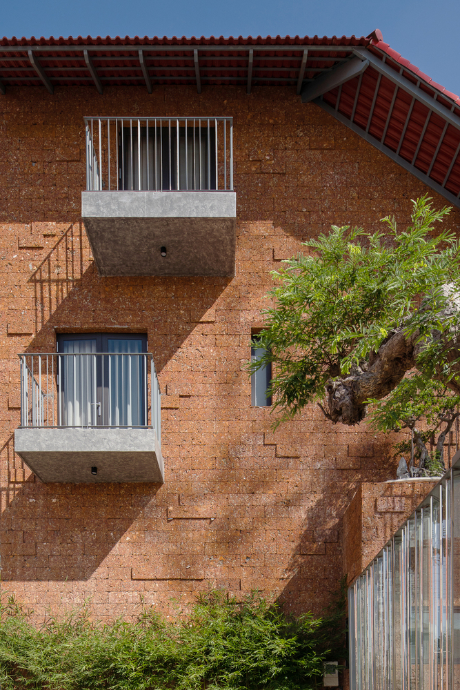 Phần mặt tiền cũng như lớp vỏ bên ngoài ngôi nhà được ốp tất cả bằng đá ong, khi kết hợp với mái ngói gấp sẽ giúp ngôi nhà có tính thẩm mỹ và bền vững hơn theo thời gian.