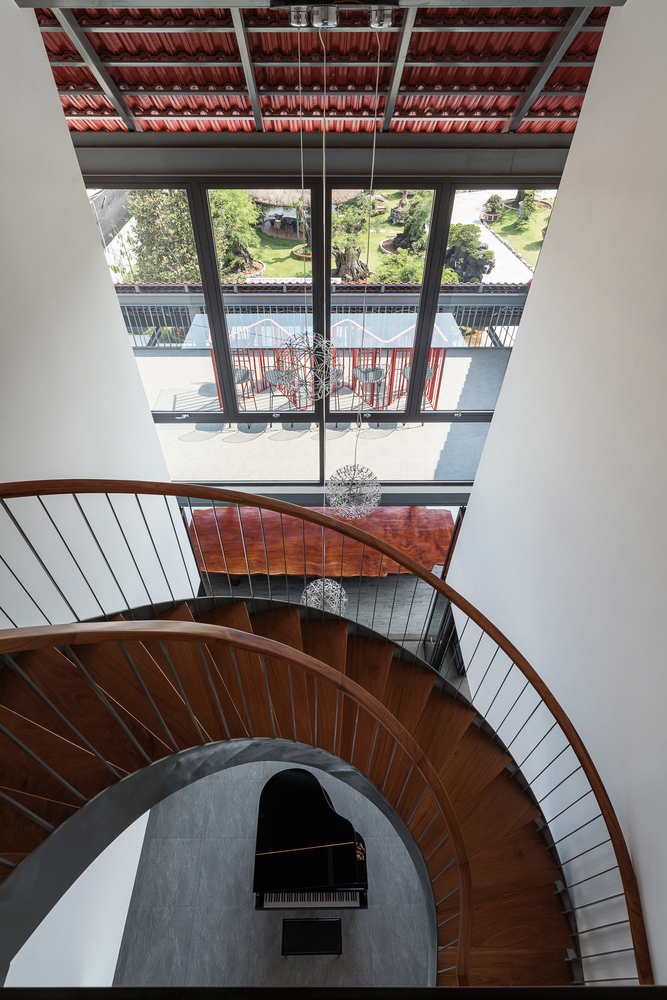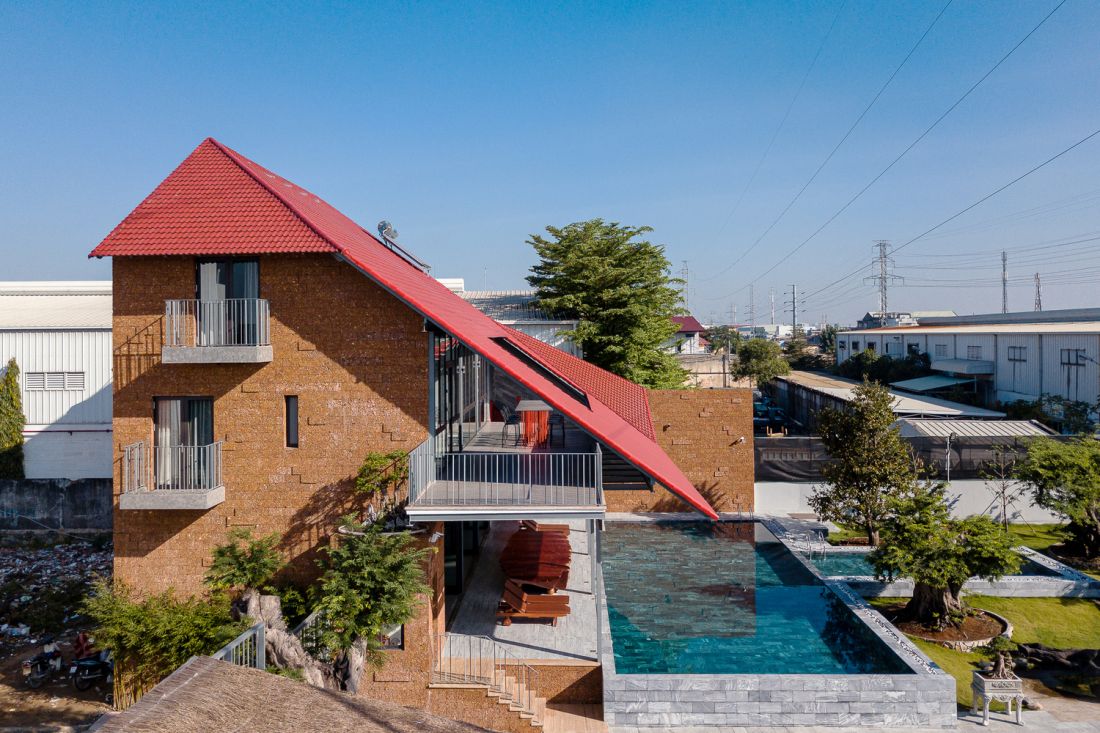 Mái ngói gấp chính là phần trung gian kết nối hai phần với nhau giúp giảm chiều cao công trình, ngoài ra còn có tác dụng che ánh nắng từ hướng Đông và hướng toàn bộ không gian sống vế phía sân vườn, bể bơi.
