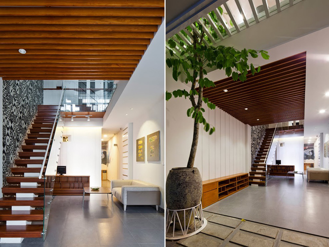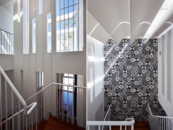 Ngoài ra, giếng trời có mặt cắt giật bậc giúp chia đều ánh sáng tự nhiên xuống bên dưới. Khí nóng sẽ thoát ra bên trên, qua hai hệ lam thoát khí ngay bên dưới mái kính ở giếng trời.