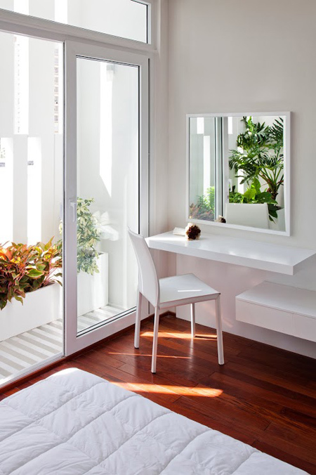 Khi còn nhỏ, người chủ của ngôi nhà ở quận 7 từng được sống ở nhà ông bà nội. Từ chỗ ngủ, anh có thể nhìn ra khu vườn cây trái sum xuê. Mỗi sớm mai, anh được đánh thức bởi tia nắng dịu dàng qua kẽ lá, đêm về có khi được nghe tiếng mưa rơi rả rích trên lá cây.