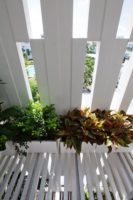 Phía trước ngôi nhà có mặt cắt giật bậc nhằm tránh nước mưa tạt và cản bớt ánh sáng trực tiếp vào nhà. Ánh sáng hay mưa có thể đi chéo xuống nuôi dưỡng cây trồng bên dưới.