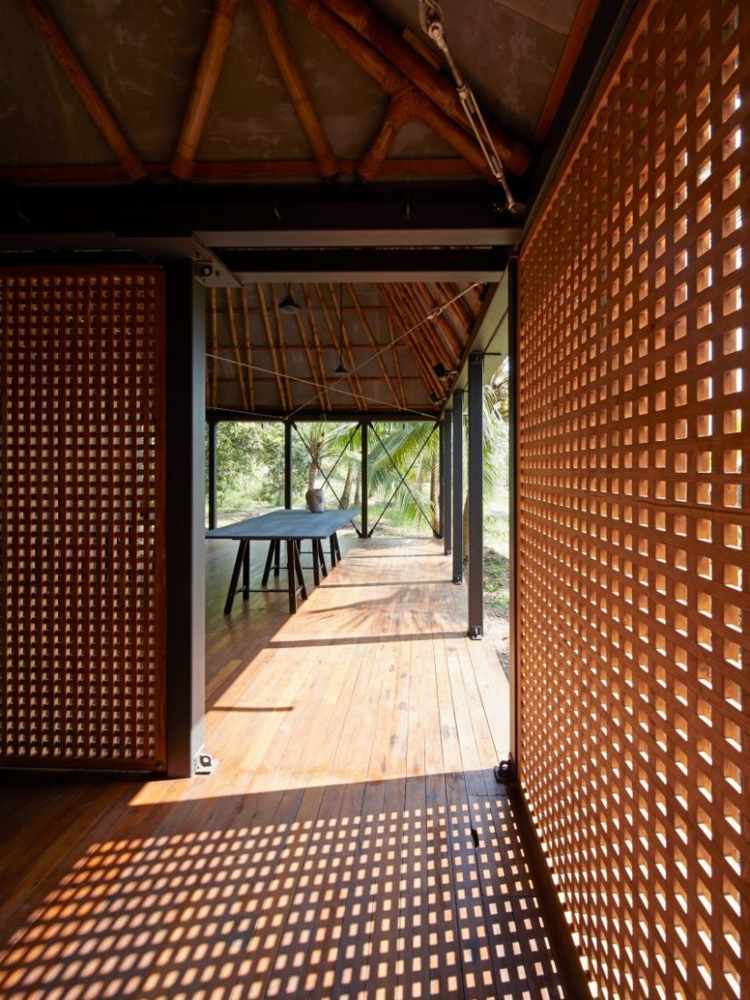 "Tre Ấn Độ có hình dạng và đường kính đặc biệt. Do đó bố cục vì kèo theo mô hình zig-zag. Có tấm lợp xi măng nhẹ bao phủ khung tre."